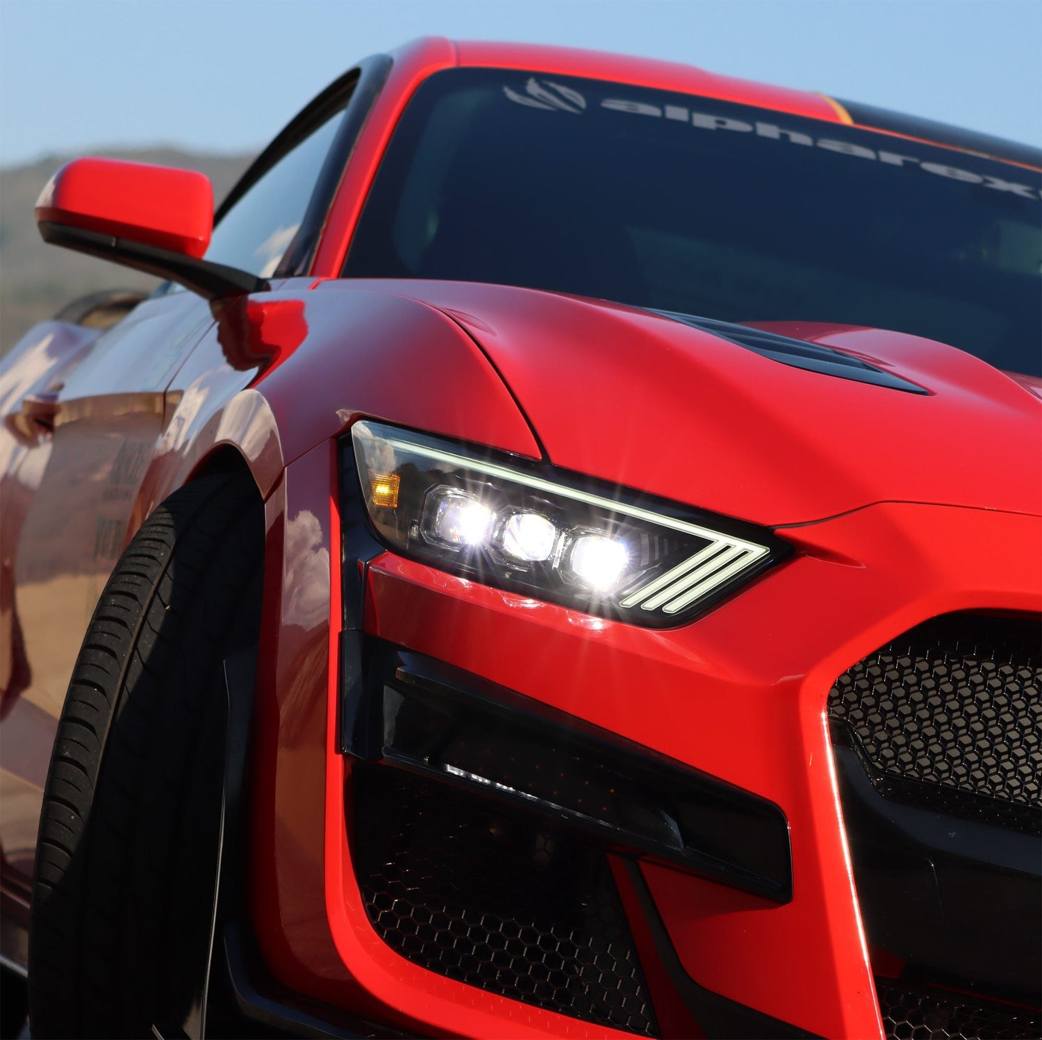 We have integrated the iconic 6th Gen Mustang S550 âtribarâ DRL into our Ford Mustang NOVA-Series headlights, using three AlphaRex signature 3D ice-cube projector lenses. These tribar LED lights can be configured for either white (default) or amber output for the DRL, and feature a sequential turn signal in amber. Additionally, the LED tube includes an activation light that provides a lighting sequence when you unlock and lock your 6th gen Mustang S550.