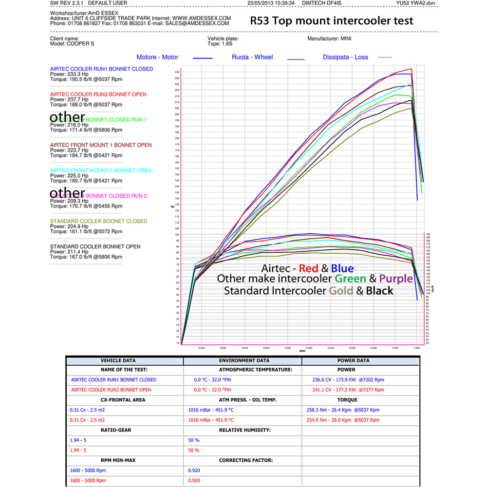 AIRTEC Test results - Tim's 233.3 bhp (Airtec cooled) Tuned Mini R53 @ Amd rolling road 10th May 2013 - Note, Results below were with bonnet closed on every run.