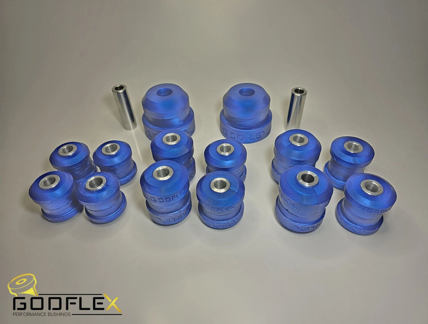 Audi TT Mk3 All Models (2014 On) Full Rear Suspension Arms Complete Transformation Polyurethane Bush Kit Our Complete Rear Kit covers the Rear Trailing Arms, Rear Upper Arms, Rear Lower Arms & Rear Spring Retaining Arms The Complete Rear End Kit (Covers every bush) For your Audi TT Mk3 All Models With Multi Link Rear Suspension - Not Rear Beam (2014 Onwards) Lightweight CNC Machined Bushing Sleeves Available Colours - Deep Space Blue, Aztec Yellow, Vortex Red/Violet Flip & Tein Green If no message is sent with colour requirements the default Deep Space Blue will be sent Please send us a message if you require a custom colour that is not listed Deep Space Blue Please message us if another colour is required What's Included ; GodFlex Performance Series Bushing Kit Complete Polyurethane Bushes for The Rear Suspension Arms High Quality CNC Machined Aluminium Bushing Sleeves 3x Sachets of bushing grease GodFlex Performance Series Polyurethane Bushing kits are a shore a hardness of 85, giving substantial stiffness over oem bushings (Similar stiffness to a PowerFlex purple for reference) Please Note Please allow 3-4 Days handling time with the full transformation kits, as products are made to order. Please Let us know if you are after a bespoke colour, not seen amongst our other products, we can make any colour you desire