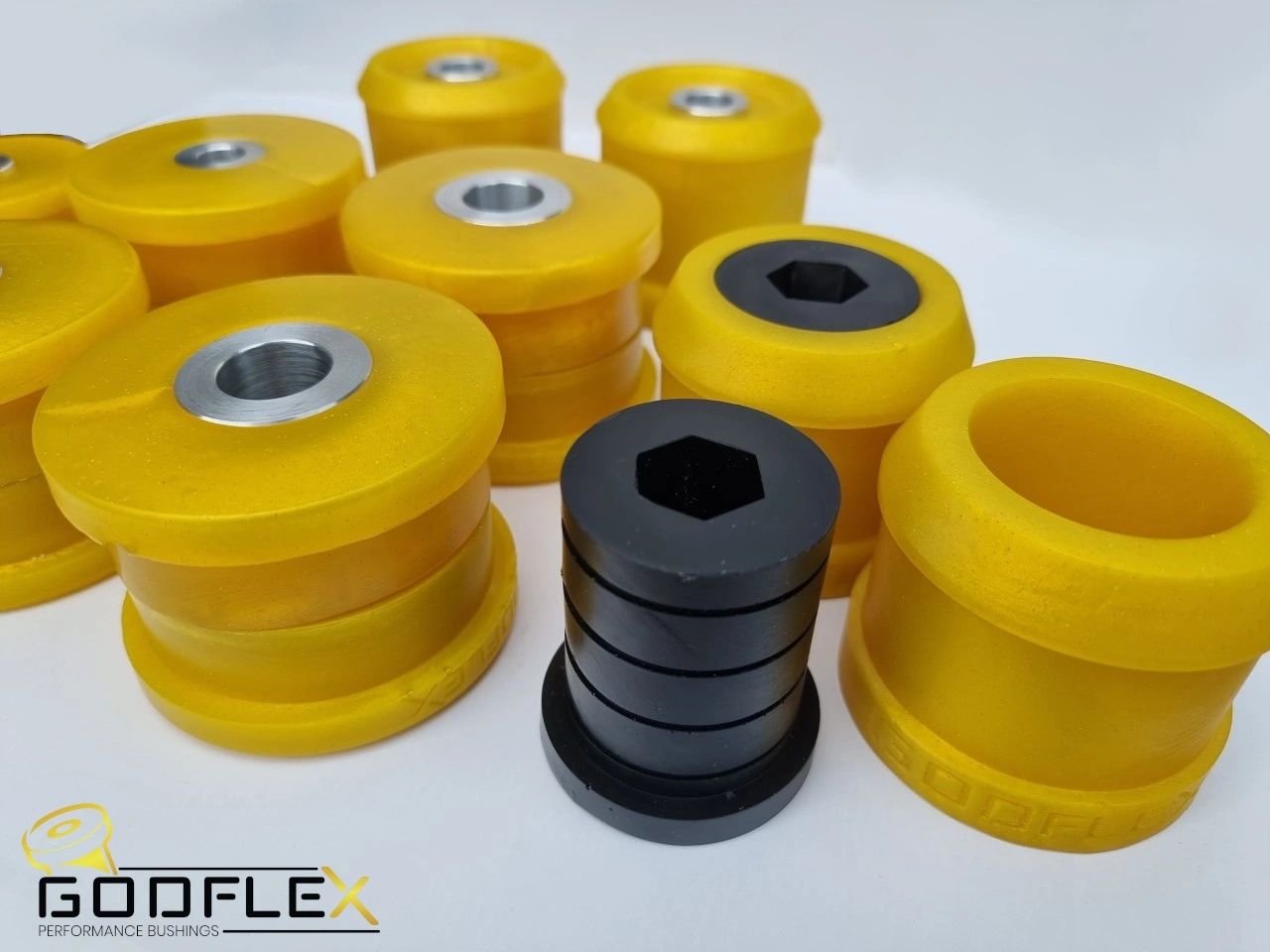 BMW E46 3 Series (2000-2005) Full Front & Rear Subframe, Wishbone , Trailing Arm & Diff Mount Bushes Kit Complete Polyurethane Bushing Kit Set of 9 Complete Polyurethane Uprated Polyurethane Bushes for the Front Wishbone Rear (66mm), Full Rear Subframe & Diff Bushing & Rear Trailing Arm Bushes For your E46 3 Series Models Lightweight CNC Machined Bushing Sleeves What's Included ; GodFlex Performance Series Bushing Kit 2x Front Wishbone Rear Bushes, 4x Complete Rear Subframe Front & Rear, 2x Rear Trailing Arms & 1x Rear Differential Mount Bushings 7x High Quality CNC Machined Bushing Sleeves 3x Sachets of bushing grease GodFlex Performance Series Polyurethane Bushing kits are a shore a hardness of 85, giving substantial stiffness over oem bushings (Similar stiffness to a PowerFlex purple for reference) Please Note Please allow 3-4 Days handling time with the full transformation kits, as products are made to order. Please Let us know if you are after a bespoke colour, not seen amongst our other products, we can make any colour you desire GodFlex Performance Series - Shore A 85 With a Shore A Hardness of 85 our Performance Series bushes offer significant improvement over the oem rubber bushes offering much firmer control over the movement of suspension components and outlast rubber bushings tenfold without deteriorating.