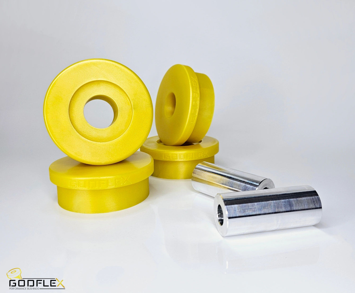 BMW E46 3 Series All Models (2000-2005) Rear Subframe Front Bushes Kit Polyurethane Bushing Kit Set of 2 Complete Polyurethane Uprated Bushes for the Rear Subframe - Front. For your E46 3 Series All Models Lightweight CNC Machined Bushing Sleeves Available Colours - Deep Space Blue, Aztec Yellow, Vortex Red/Violet Flip & Tein Green If no message is sent with colour requirements the default Aztec Yellow Gold will be sent What's Included ; GodFlex Performance Series Bushing Kit 2x Complete Polyurethane Bushes for The Rear Subframe - Front 1x Sachets of bushing grease GodFlex Performance Series Polyurethane Bushing kits are a shore a hardness of 85, giving substantial stiffness over oem bushings (Similar stiffness to a PowerFlex purple for reference) Please Note Please allow 3-4 Days handling time with the full transformation kits, as products are made to order. Please Let us know if you are after a bespoke colour, not seen amongst our other products, we can make any colour you desire
