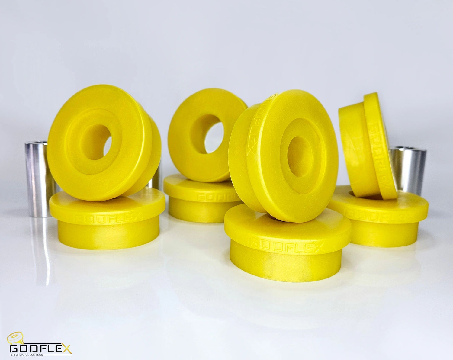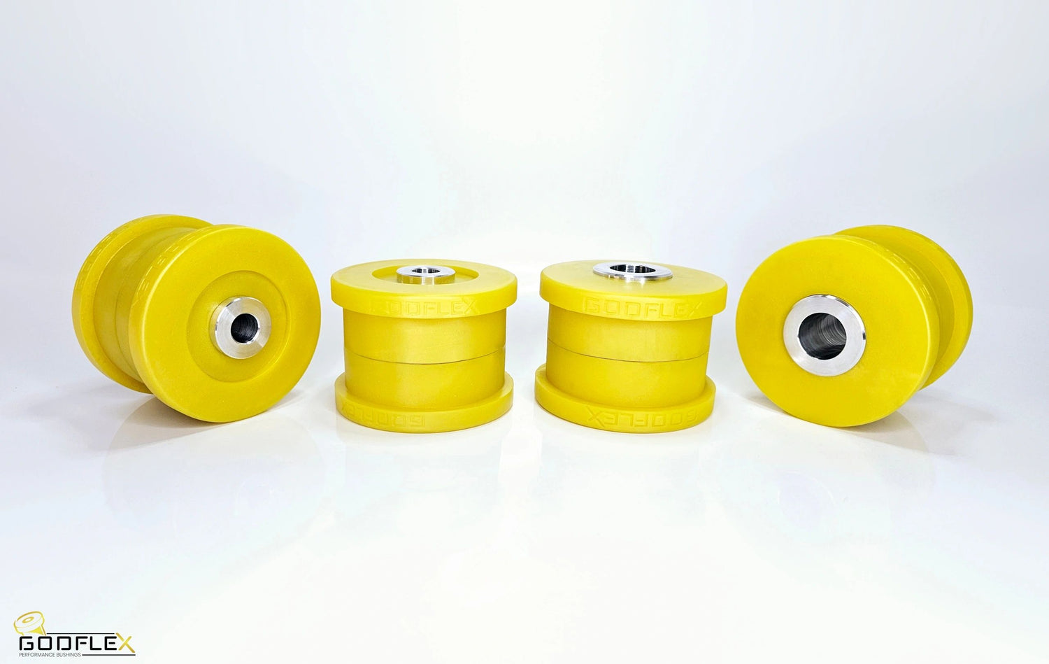 BMW Z4 E89 All Models (2009-2017) Rear Subframe Bushes Kit Polyurethane Bushing Kit Set of 4 Complete Polyurethane Uprated Bushes for the Rear Subframe For your E89 Z4 Models Lightweight CNC Machined Bushing Sleeves What's Included ; GodFlex Performance Series Bushing Kit 4x Complete Polyurethane Bushes for The Rear Subframe 4x High Quality Aluminium CNC Bushing Sleeves 2x Sachets of bushing grease GodFlex Performance Series Polyurethane Bushing kits are a shore a hardness of 85, giving substantial stiffness over oem bushings (Similar stiffness to a PowerFlex purple for reference) Please Note Please allow 3-4 Days handling time with the full transformation kits, as products are made to order. Please Let us know if you are after a bespoke colour, not seen amongst our other products, we can make any colour you desire GodFlex Performance Series - Shore A 85 With a Shore A Hardness of 85 our Performance Series bushes offer significant improvement over the oem rubber bushes offering much firmer control over the movement of suspension components and outlast rubber bushings tenfold without deteriorating.