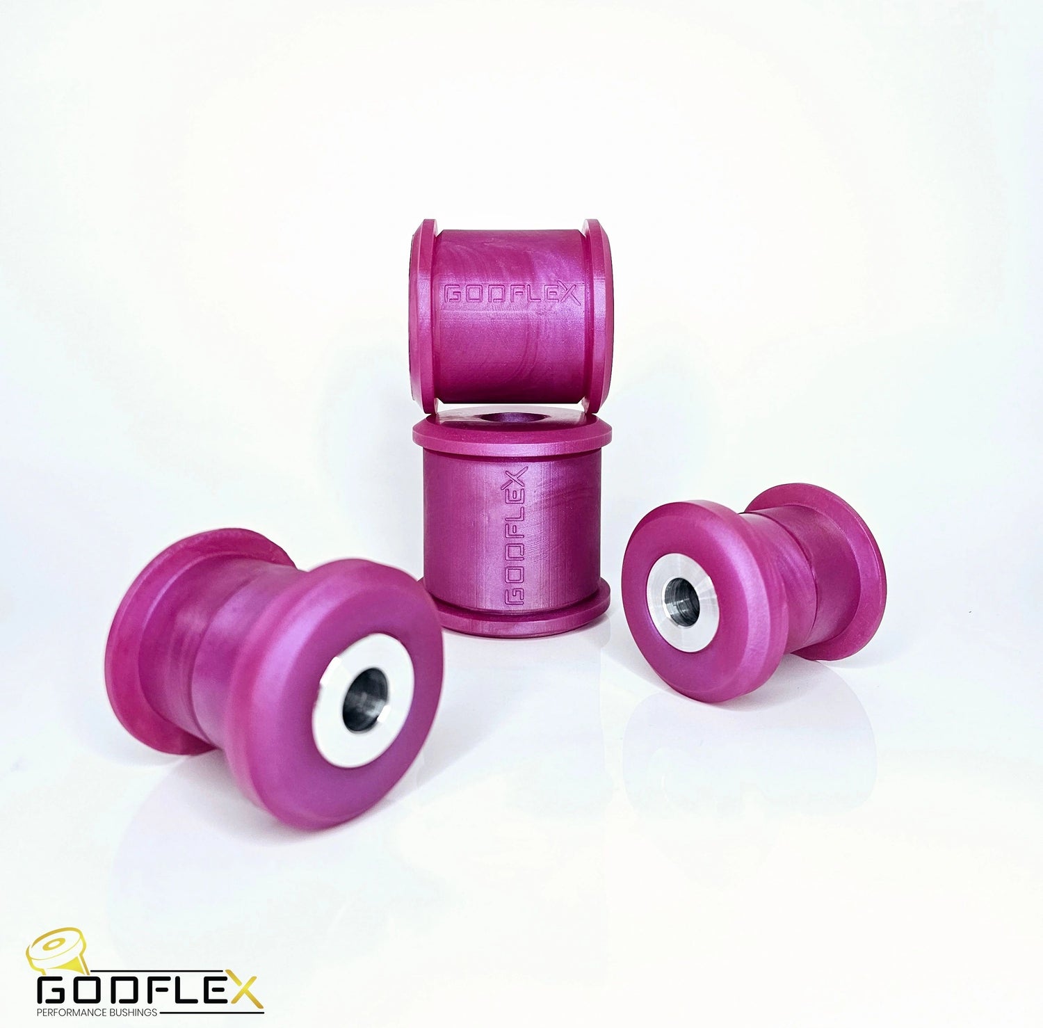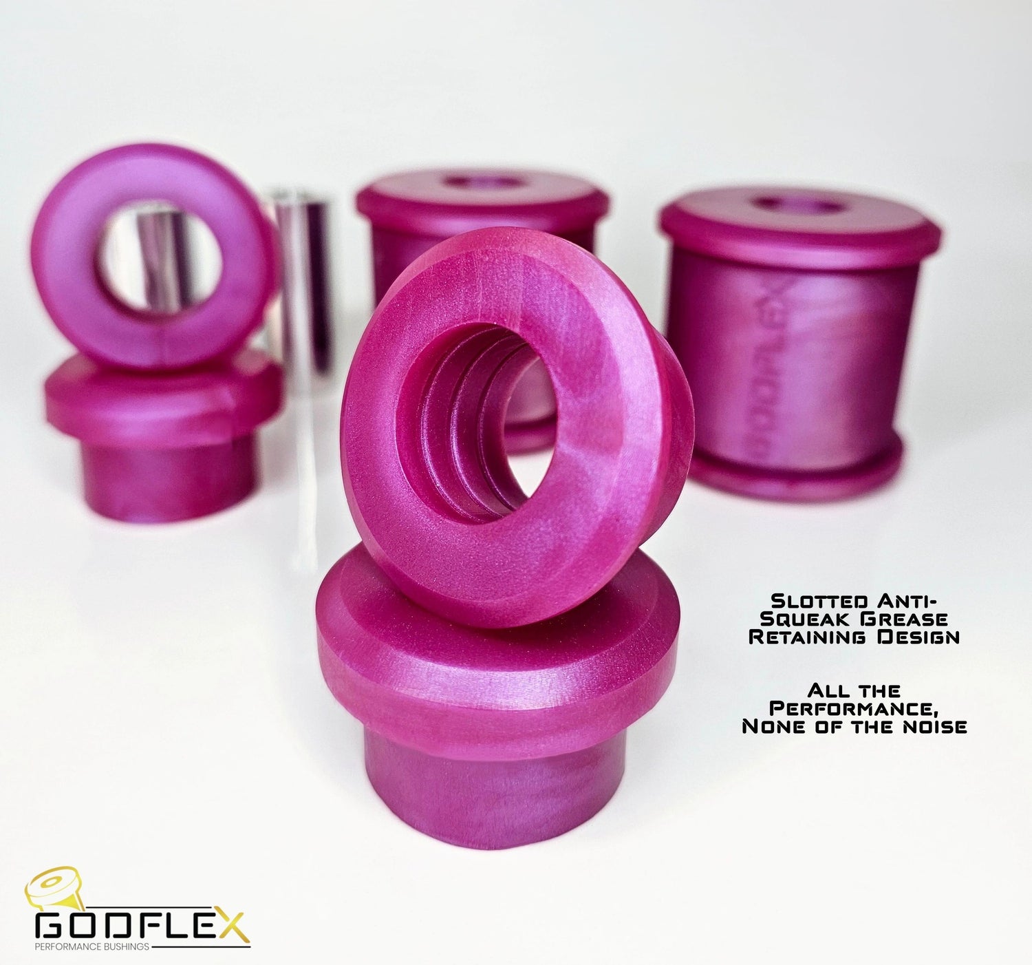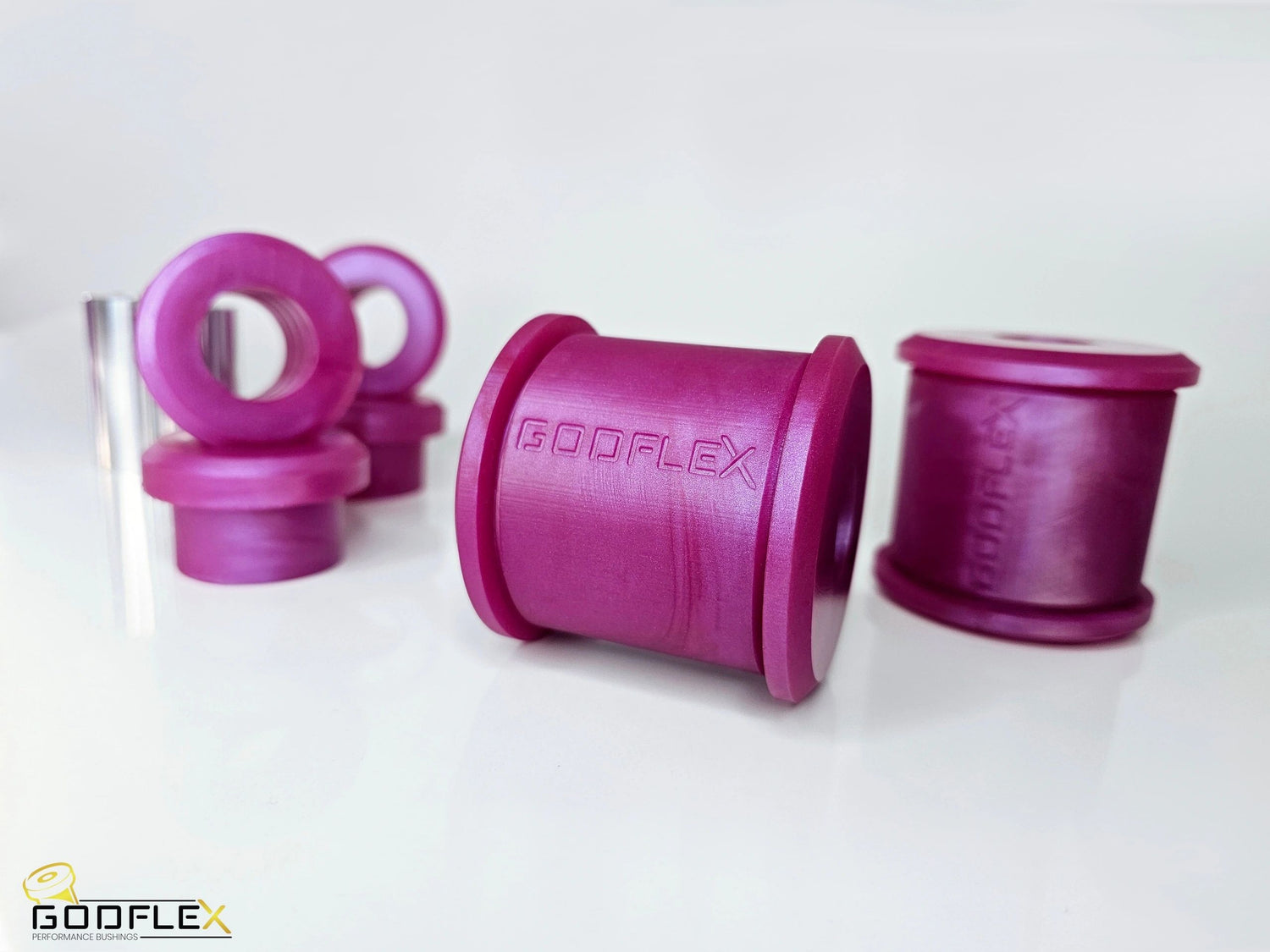 Ford Fiesta Mk6 All Models Inc Zetec S/ST (2002-2008) Front Wishbone Suspension Arm Bushes Bushing Kit Set of 4 Complete Polyurethane Uprated Bushes for the Front Suspension / Wishbone Arms For your Mk6 Ford Fiesta All Models Including ST / Zetec S 2002-2008 Lightweight CNC Machined Bushing Sleeves What's Included ; GodFlex Performance Series Bushing Kit 4x Complete Bushes for the Front Suspension Arms 2x Aluminium CNC Machined Bushing Sleeves 1x Sachets of Bushing Grease GodFlex Performance Series Polyurethane Bushing kits are a shore a hardness of 85, giving substantial stiffness over oem bushings (Similar stiffness to a PowerFlex purple for reference) Please Note Please allow 3-4 Days handling time with the full transformation kits, as products are made to order. Please Let us know if you are after a bespoke colour, not seen amongst our other products, we can make any colour you desire GodFlex Performance Series - Shore A 85 With a Shore A Hardness of 85 our Performance Series bushes offer significant improvement over the oem rubber bushes offering much firmer control over the movement of suspension components and outlast rubber bushings tenfold without deteriorating.