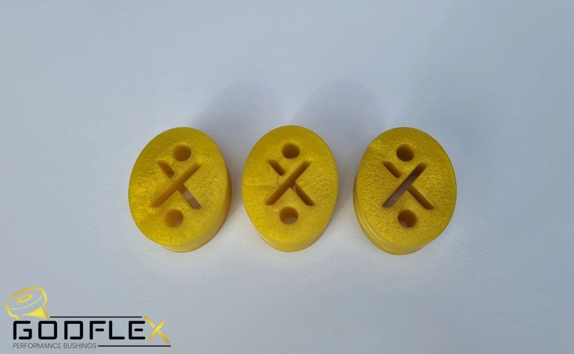 Ford Focus ST & RS Mk2 (2005-2010) Down Pipe & Cat Section Polyurethane Exhaust Hanger Bushes Uprated Rigid Bushing Kit Set of 3 Complete Polyurethane Uprated Bushes for the Down pipe and Cat Section. Offers much firmer control and less movement over your Exhaust system as well as much longer life over the fast degrading poor quality of the OEM Rubber. For your Mk2 Ford Focus ST & RS Models What's Included ; GodFlex Performance Series Bushing Kit 3x Uprated Rigid Polyurethane Downpipe & Cat Section Bushes GodFlex Performance Series Polyurethane Bushing kits are a shore a hardness of 85, giving substantial stiffness over oem bushings (Similar stiffness to a PowerFlex purple for reference) Please Note Please allow 3-4 Days handling time with the full transformation kits, as products are made to order. Please Let us know if you are after a bespoke colour, not seen amongst our other products, we can make any colour you desire