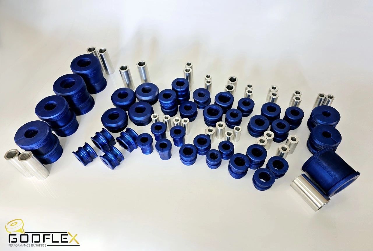 Nissan 350Z Z33 (2002-2009) Full Front & Rear Suspension Arms, Subframe, Diff & Anti Roll Bar Bushes Complete Transformation Polyurethane Bush Kit Set of 37 Complete Polyurethane Uprated Bushes for The Front & Rear Arms, ARBs, Subframe & Diff For your Z33 Nissan 350Z Models Lightweight CNC Machined Bushing Sleeves Available Colours - Deep Space Blue, Aztec Yellow, Vortex Red/Violet Flip & Tein Green What's Included ; GodFlex Performance Series Bushing Kit 37x Complete Polyurethane Bushes for The Front & Rear Suspension Arms & ARBs 33x High Quality CNC Machined Aluminium Bushing Sleeves 6x Sachets of bushing grease GodFlex Performance Series Polyurethane Bushing kits are a shore a hardness of 85, giving substantial stiffness over oem bushings (Similar stiffness to a PowerFlex purple for reference) Please Note Please allow 3-4 Days handling time with the full transformation kits, as products are made to order. Please Let us know if you are after a bespoke colour, not seen amongst our other products, we can make any colour you desire