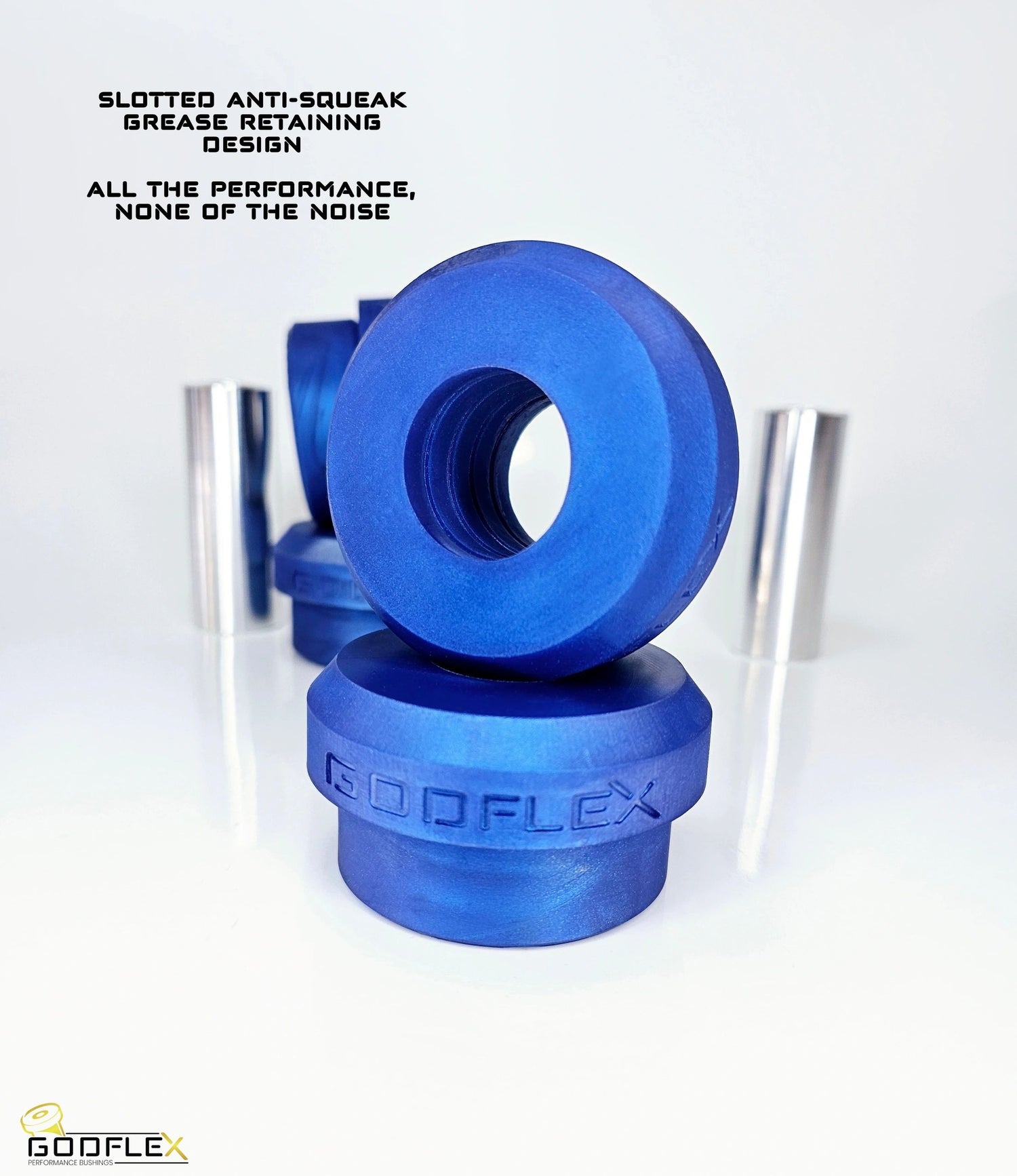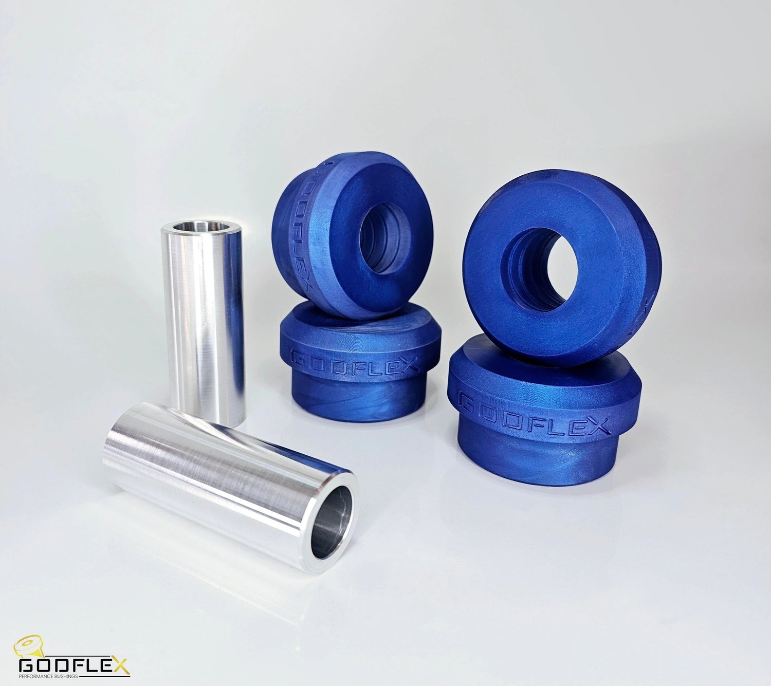 Nissan 350Z Z33 (2002-2009) Front Radius / Banana Suspension Arm Bushes Polyurethane Bush Kit Set of 2 Complete Polyurethane Uprated Bushes for The Front Radius Arms also known as Banana / Compression Arms For your Z33 Nissan 350Z Models Lightweight CNC Machined Bushing Sleeves Available Colours - Deep Space Blue, Aztec Yellow Gold, Vortex Red/Violet Flip & Cosmic Green What's Included ; GodFlex Performance Series Bushing Kit 2x Complete Polyurethane Bushes for The Front Upper Arms 2x High Quality CNC Machined Aluminium Bushing Sleeves 1x Sachets of bushing grease GodFlex Performance Series Polyurethane Bushing kits are a shore a hardness of 85, giving substantial stiffness over oem bushings (Similar stiffness to a PowerFlex purple for reference) Please Note Please allow 3-4 Days handling time with the full transformation kits, as products are made to order. Please Let us know if you are after a bespoke colour, not seen amongst our other products, we can make any colour you desire