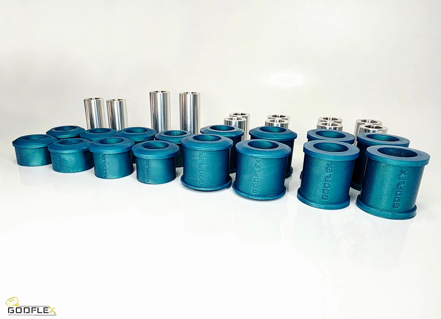 Volvo V40 (2012-2019) Complete Polyurethane Rear Suspension Arms Bushing Kit Rear End Overhaul Bushing Kit Set of 12 Complete Polyurethane Uprated Bushes for The Rear Suspension Arms For your Volvo V40 All Models 2012-2019 Lightweight CNC Machined Bushing Sleeves Available Colours - Deep Space Blue, Aztec Yellow, Vortex Red/Violet Flip & Tein Green If no message is sent with colour requirements the default Cosmic Green will be sent Please send us a message if you require a custom colour that is not listed Cosmic Green Please message us if another colour is required What's Included ; GodFlex Performance Series Bushing Kit 12x Complete Polyurethane Bushes for The Rear Suspension Arms 12x High Quality CNC Machined Aluminium Bushing Sleeves 3x Sachets of bushing grease GodFlex Performance Series Polyurethane Bushing kits are a shore a hardness of 85, giving substantial stiffness over oem bushings (Similar stiffness to a PowerFlex purple for reference) Please Note Please allow 3-4 Days handling time with the full transformation kits, as products are made to order. Please Let us know if you are after a bespoke colour, not seen amongst our other products, we can make any colour you desire