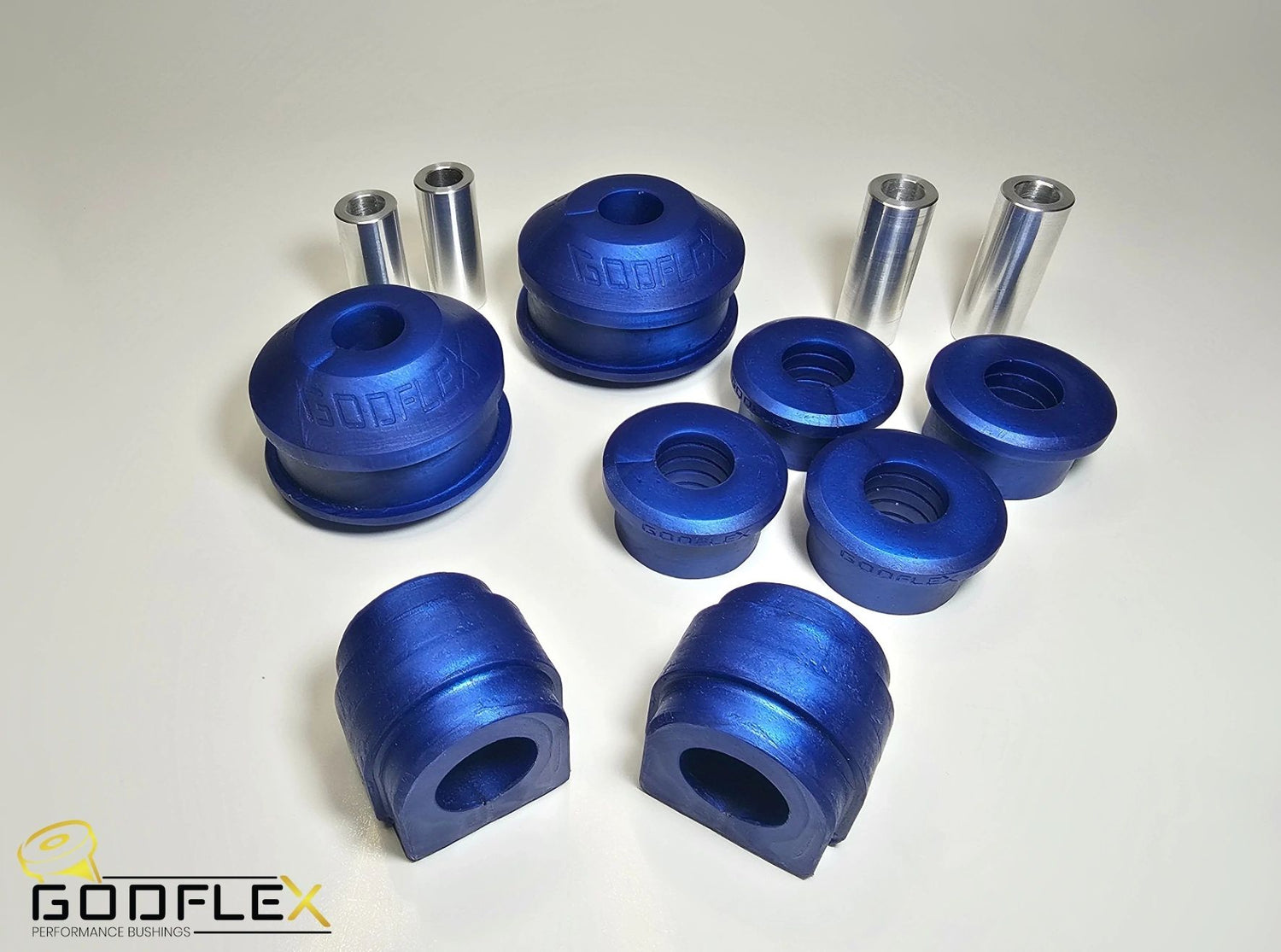 VW Golf 7 / 7.5 R (2012-2019) Front Suspension Arms & Front Anti Roll Bar Bush Kit Complete Polyurethane Bush Kit Our Complete Front End Kit covers the Front Suspension Arms and the Front ARB bushes (24mm) For your VW Golf 7 R Mk7 Models (2012-2019) Lightweight CNC Machined Bushing Sleeves Available Colours - Deep Space Blue, Aztec Yellow, Vortex Red/Violet Flip & Tein Green If no message is sent with colour requirements the default Deep Space Blue will be sent Please send us a message if you require a custom colour that is not listed Deep Space Blue Please message us if another colour is required What's Included ; GodFlex Performance Series Bushing Kit Complete Polyurethane Bushes for The Front Suspension Arms & ARBs High Quality CNC Machined Aluminium Bushing Sleeves 1x Sachets of bushing grease GodFlex Performance Series Polyurethane Bushing kits are a shore a hardness of 85, giving substantial stiffness over oem bushings (Similar stiffness to a PowerFlex purple for reference) Please Note Please allow 3-4 Days handling time with the full transformation kits, as products are made to order. Please Let us know if you are after a bespoke colour, not seen amongst our other products, we can make any colour you desire